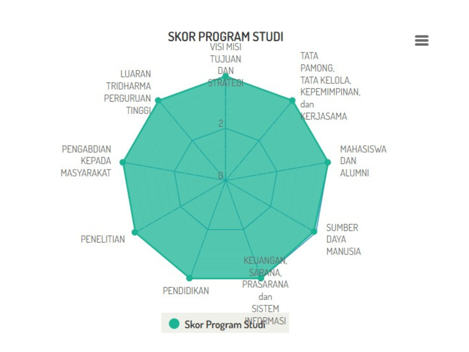 Hasil ini divisualisasikan dalam bentuk grafis sarang laba-laba di mana hampir seluruh bidang terlihat terisi penuh. Satu-satunya komponen yang belum mencapai nilai maksimal adalah Sumber Daya Manusia, yang memperoleh skor 3. Capaian ini menjadi catatan perbaikan bagi program studi. Berdasarkan hasil desk evaluation auditor, hal ini terutama terkait dengan pemerataan beban kerja dosen.