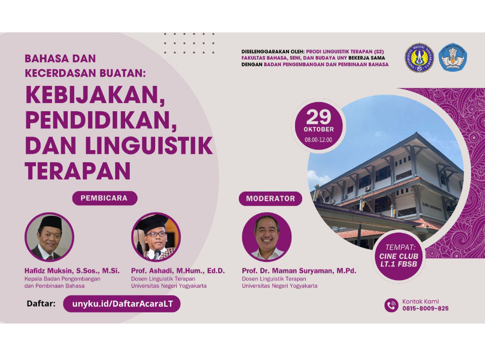 Prodi Linguistik Terapan (S2) FBSB UNY bekerja sama dengan Badan Pengembangan dan Pembinaan Bahasa menghadirkan kuliah pakar yang akan membahas hubungan antara bahasa, pendidikan, dan kecerdasan buatan—isu penting di tengah transformasi digital saat ini.